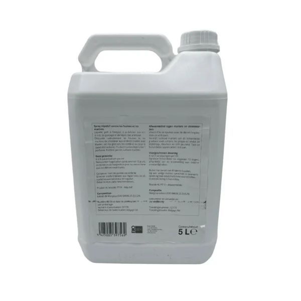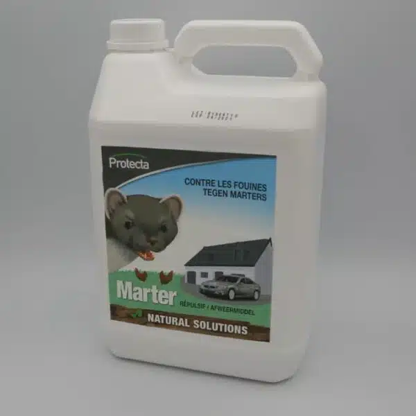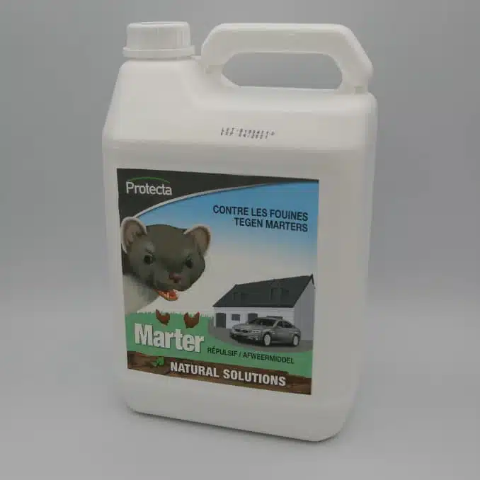 Ce répulsif est un liquide naturel prêt à l’emploi. Il est utilisé par les professionnels et les fédérations de chasse. Il permet de traiter les grandes surfaces telles que les combles, les greniers et les garages fréquentés par les fouines et les martres. Ces nuisibles sont des rongeurs nocturnes. Ils apprécient particulièrement la chaleur des combles et des greniers, mais aussi des capots de voiture. Ils détériorent les câbles électriques et s’attaquent aux volailles. Ces espèces protégées ne peuvent être tuées. La période de reproduction des fouines se situe entre juin et septembre. Les fouines peuvent vivre entre 8 et 11 ans, alors que les martres ont une longévité de 13 à 15 ans. Ce répulsif est efficace pendant 3 semaines après l’application dans les zones de passage et de repos des fouines et des martres. Pour une efficacité durable et multipliée, renouvelez le traitement toutes les semaines pendant 3 semaines afin de vous assurer que les nuisibles ne reviennent pas. Le produit répulsif, incolore et très peu odorant, n’altère pas les zones traitées. Conçu à base de plantes, il est sans danger pour les animaux de compagnies. Son odeur, fort déplaisante pour les fouines, est agréable pour l’homme. Vous pouvez utiliser ce produit conjointement avec d’autres solutions anti-nuisibles comme les cages de capture. Manipulez ce répulsif, à base d’ingrédients naturels concentrés, avec des gants, un masque et des lunettes de protection afin de vous prémunir de tous risques. Lisez attentivement les informations relatives au produit avant chacune de vos utilisations. Utilisez les produits biocides avec précaution. Avant toute utilisation, lisez l’étiquette et les informations concernant le produit.
