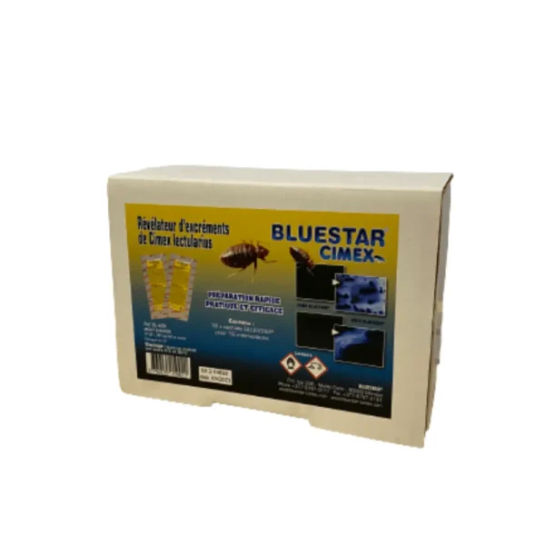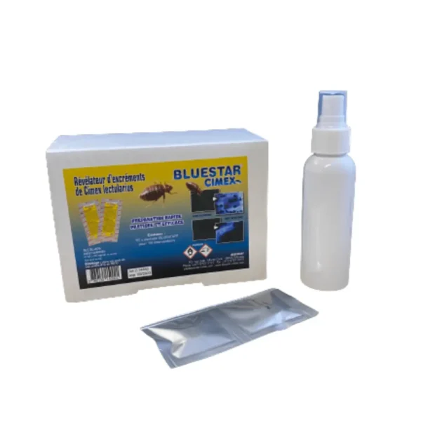 Ce kit de 16 révélateurs rend visibles les excréments de punaises de lit par une réaction chimique lumineuse. Extrêmement sensibles, ces 16 révélateurs permettent de détecter la moindre trace d’excréments de ces nuisibles, même s’ils sont invisibles à l’œil nu ou préalablement lavés. Facile d’emploi, il suffit de mettre 100 à 150 ml d’eau dans le pulvérisateur propre. Ouvrez-le sachet de révélateur et mettez les deux comprimés (1 beige, 1 blanc) à diluer dans l’eau. Refermez le pulvérisateur et mélangez, pendant quelques minutes, pour obtenir la dilution complète des comprimés. Le mélange peut s’utiliser pendant quelques heures. Ajustez la pulvérisation. Les pulvérisations du produit révélateur doivent s’effectuer dans le noir complet. Ils s’utilisent dans une pièce obscure, sans lumière, volets, rideaux et porte fermés. La lumière risque d’empêcher la visibilité de la réaction. Une réaction lumineuse peut avoir lieu malgré l’absence d’excréments de punaises de lit. Il faut donc être en mesure de distinguer les différents types de luminescences. Ces faux positifs apparaissent parfois lorsque le produit rentre en contact avec certaines surfaces, comme la peinture acrylique, les produits chlorés et les vernis… Néanmoins, la réaction lumineuse n’est pas la même que lorsqu’elle révèle la présence d’excréments. Lorsque le révélateur illumine les excréments des punaises de lit, la lumière est plus intense et brillante. Elle apparaît immédiatement et non progressivement, comme c’est le cas lors de faux positifs.
